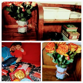 “Mamma, compiamo i quetti fioli ?” “Topino, vuoi i fiori ? Perché ?” “Mamma! Sono belli quetti fioli, io piace tanto, noi piendi fioli belli belli ?”. Ovviamente abbiamo preso i fiori belli, e, a casa, abbiamo preparato un “vasino calino calino” tutto per loro. Mi ammalia la sua capacità di apprezzare le cose belle, un colore che gli piace, anche nella carta plasticosa del supermercato, o nelle crepe di un muro, che ai suoi occhi, non sono sfregi, ma disegni del tempo. E mi auguro per questi giorni nuovi, di saperli spacchettare uno ad uno, con lo stupore dei bambini e la consapevolezza del regalo che sono, anche quelli di pioggia, tristi o solo noiosi, e che sta a noi, riempire di luce. Ci auguro di continuare ad allenarci alla bellezza, quella sfacciatamente travolgente, e quella gentile, che sorprende lo sguardo, quando viene scoperta; di sapere godere delle persone che amiamo, custodirne con cura l’ affetto, e di regalarci nuove amicizie. Mi preparo ad un tempo di nuovi inizi, accompagnati da un poco di timore, ma lo prendo per mano, e salto più in alto. Voglio sorrisi allegri e occhi dolci, sorprese e risate buffe. Festeggio con un picnic sul divano, un bel cartone per tutti e il vino che piace a noi grandi. Per salutare i giorni passati, e, soprattutto, dare il benvenuto a quelli nuovi, tutti da inventare, ho i compagni di festa migliori del mondo: uno piccolo, uno grande e una gattina dai riflessi blu.
