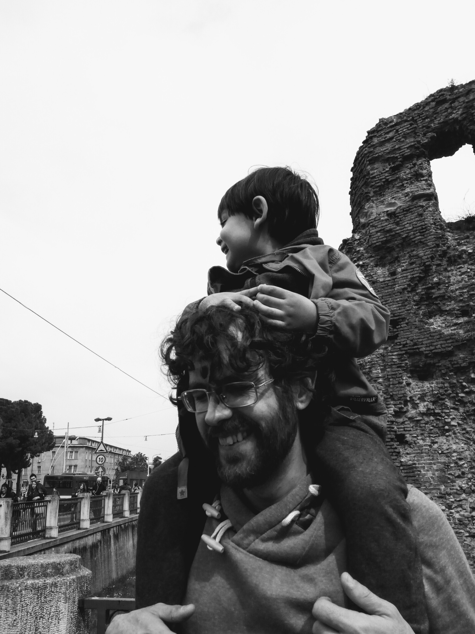 Lo guardi con occhi luminosi di amore, e lo so, a volte li sfiora l’ ombra della paura, quella che solo i genitori conoscono, ma tu la fai scappare, armato di coccole e risate e tranquillizzi anche me, con la quella sicurezza nuova, arrivata insieme ad una tenerezza gentile, che prima intuivo soltanto, con cui ti prendi cura del piccolo meraviglio. Con fierezza racconti che son state tue, le prime braccia ad accoglierlo al mondo, e che subito aveva il singhiozzo, proprio come te. Nel gioco delle somiglianze ho sempre amato riconoscere in lui così tanto dei tuoi tratti, con la magia di vederti un po’ bimbo, attraverso nel suo nasino delicato e i capelli ramati. Con costanza, allegria e molto amore, avete tessuto un legame tutto vostro, condito di marachelle e prime scoperte, parole inventate e canzoni, un’ intesa bellissima e privata che si srotola nei vostri momenti insieme, ma che, sa accogliere anche me, quando con sguardi complici, mi raccontate le vostre avventure. Senza saperlo gli insegni a prendersi cura di chi ama, dei piccoli e fragili, e la micia ha così un paladino pronto a difenderla e coccolarla, con qualche sgridata di mezzo, che il piccolo ” flatellino maggiole” elargisce con allegra soddisfazione. Lo sai far correre forte, con occhi attenti e braccia spalancate per accoglierlo all’arrivo, e festeggi con sincero entusiasmo ogni traguardo che per lui sia importante. Ascolti le sue storie, lunghe e articolate e gli racconti il tuo tempo senza di lui, annullando le assenze della routine quotidiana, con questa presenza calda e sicura che gli regali da sempre. Tanti auguri a te, che ti inventi papà ogni giorno, e rendi semplice e bello essere famiglia. E auguri al mio babbo, che mi ha dato l’ idea di come può essere un bravo papà.